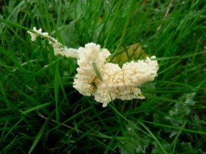 We have recently had a query about a strange substance which looks like vomit, curdled custard or even a strange flower along leaves and stalks of grass all over the Moor. It is in fact a fungus called Dog’s Vomit Slime Mould which is quite prevalent on the Moor this autumn. It is completely harmless.