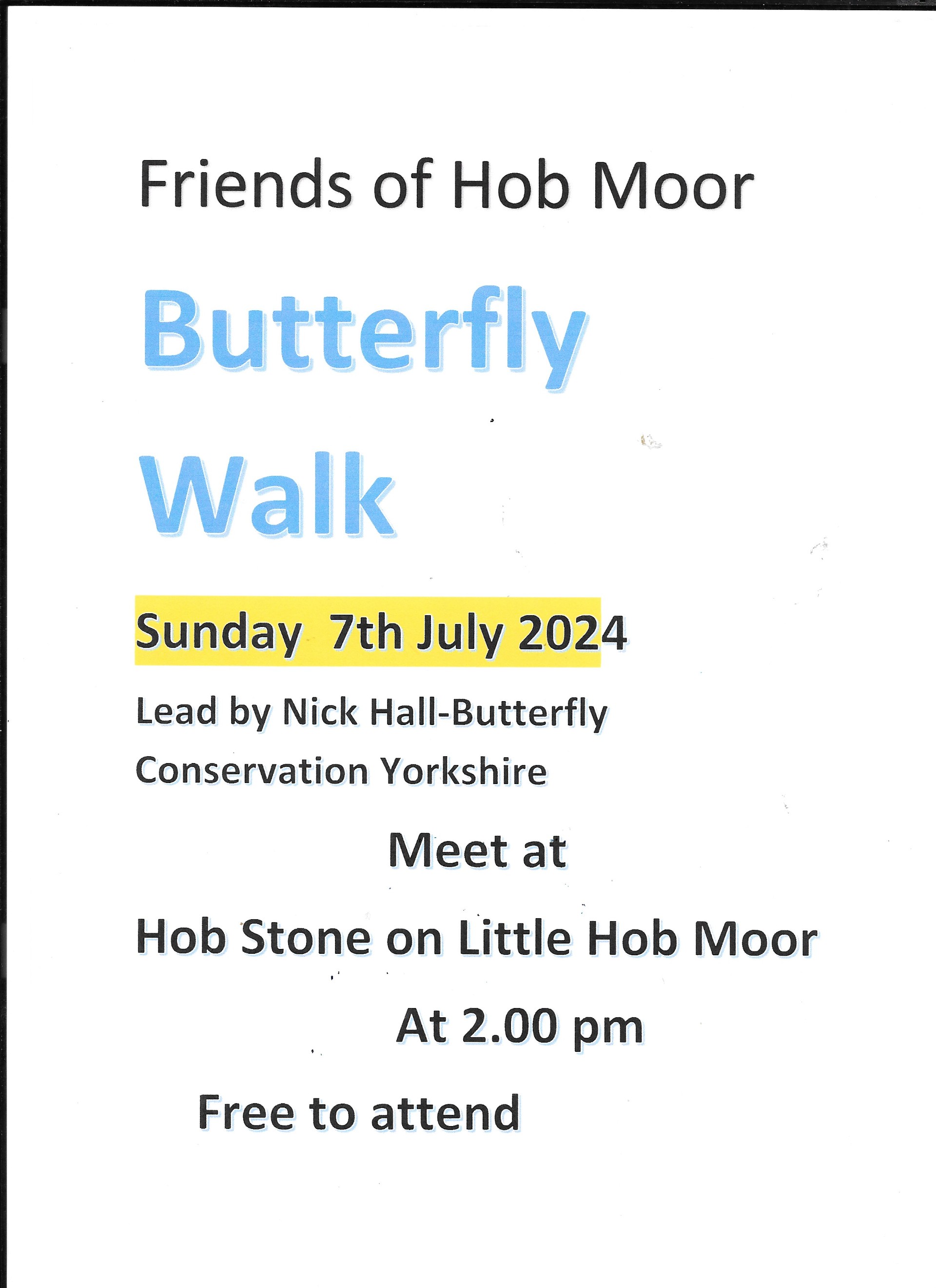 Butterfly Walk 7th July 2pm Nick Hall of the Butterfly Conservation Trust will lead a Butterfly walk onSunday 7th July at 2.00pm,meeting at the Hob Stone on Little Hob Moor. This will be FREE to attend. Share this: Click to share on X (Opens in new window) X Click to share on Facebook (Opens in new window) Facebook Like Loading...