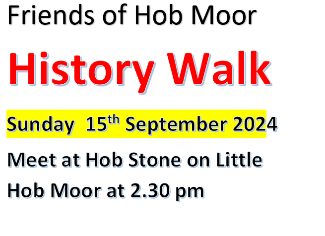 Hello Everyone There will be a History walk tomorrow at 2:30pm on Sunday 15th September 2024. All about the history of Hob Moor. FREE to attend. Hope to see you there. Meet at the Hob Stone on Little Hob Moor.