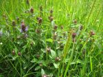 Meadow buttercup, bulbous buttercup and common sorrel are abundant and there are patches of red clover and white clover. Occasional species include field woodrush, germander speedwell, meadow vetchling and yarrow; pignut is abundant towards the north-east part of the moor. There are large areas of creeping thistle, some small patches of great burnet, and some individual spear thistles.